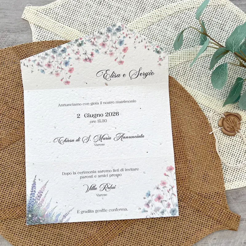 È un invito che unisce eleganza e sostenibilità, fatto a mano con carta naturale che contiene al suo interno veri semi di fiori di campo. Dopo il matrimonio, può essere piantata e darà vita a nuovi fiori: un simbolo di amore che continua a crescere.