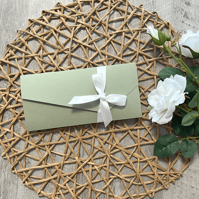 Quando la si tiene in mano, questa partecipazione a busta verde salvia trasmette subito una sensazione di cura e armonia. È morbida, leggera, ma solida. La combinazione del colore verde salvia e del bianco è raffinata e attuale, mai banale. Il nastro in raso bianco aggiunge un movimento delicato e completa il tutto in modo naturale.