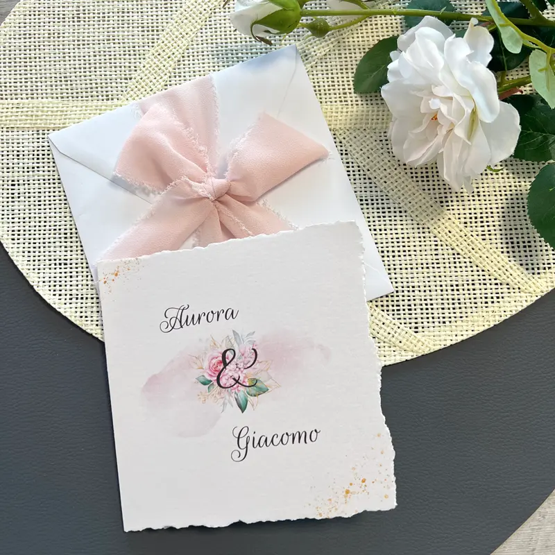 Il punto focale del design, come visibile nell’immagine, è la delicatezza della grafica: i nomi degli sposi, scritti con un carattere calligrafico che danza sulla carta, sono incorniciati o accompagnati da elementi floreali acquerellati. Tuttavia, ciò che rende questa partecipazione originale e inimitabile non è solo ciò che è stampato sopra, ma la carta stessa.