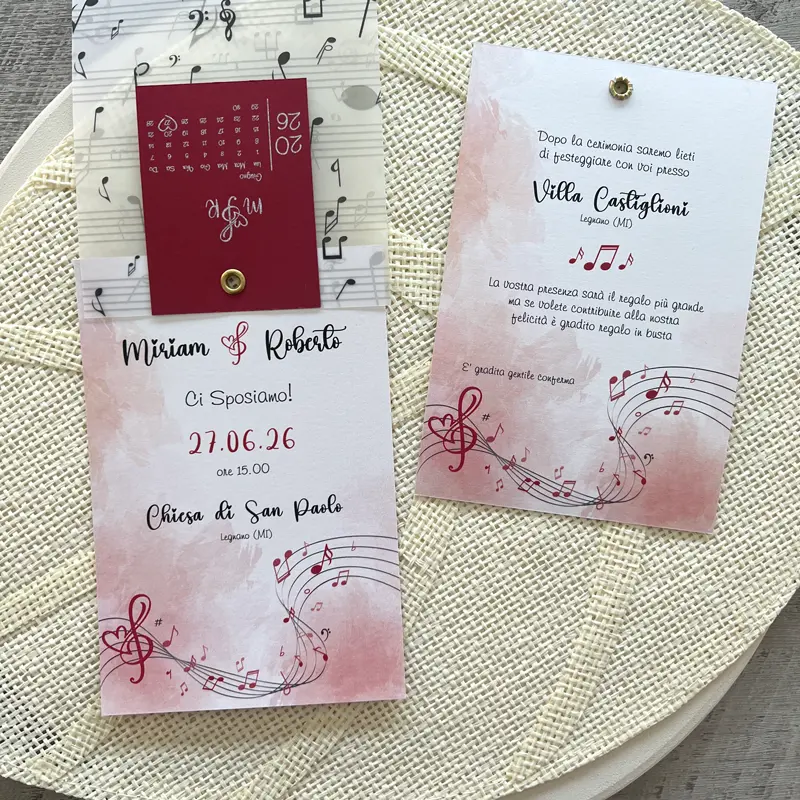 È il cuore della partecipazione. La stampa è fronte e retro, con una grafica pulita e lineare. Lo sfondo ha sfumature leggere che non disturbano la lettura. Le note musicali accompagnano il testo con discrezione. Le informazioni su cerimonia e ricevimento sono chiare e ben distribuite. È un invito facile da leggere, senza fronzoli, ma con un tocco che richiama il tema musicale.