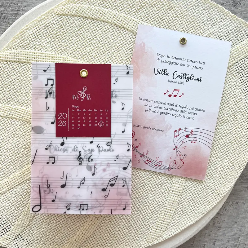 Il foglio traslucido è quello che dà subito carattere alla partecipazione. È semitrasparente e lascia intravedere l’invito sotto. Le note e il pentagramma in stampa nera creano un effetto visivo semplice ma d’impatto. È l’elemento che fa capire a colpo d’occhio che si tratta di inviti con note musicali.